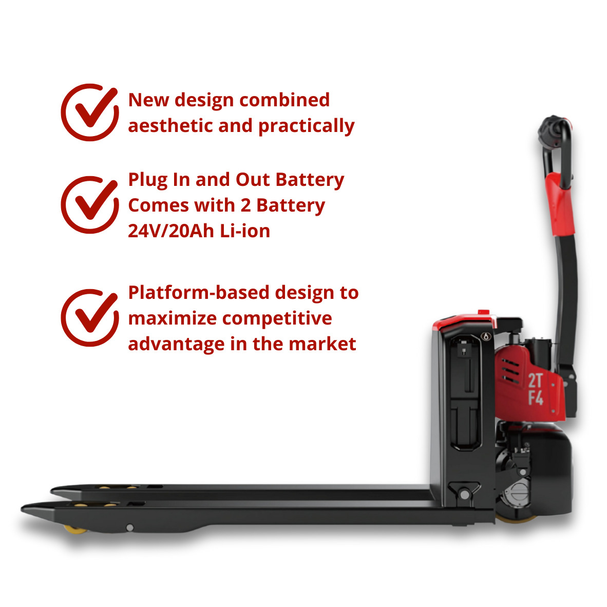 F4 201 adalah forklift listrik bertenaga 48V dengan kapasitas angkut hingga 2 ton, menawarkan produktivitas tinggi melalui desain tiller head baru, opsi roda penstabil, dan baterai Li-Ion plug in & out yang mudah diganti. Dengan desain platform fleksibel dan kemampuan memuat hingga 164 unit per kontainer 40', F4 201 memberikan penghematan biaya distribusi yang signifikan.