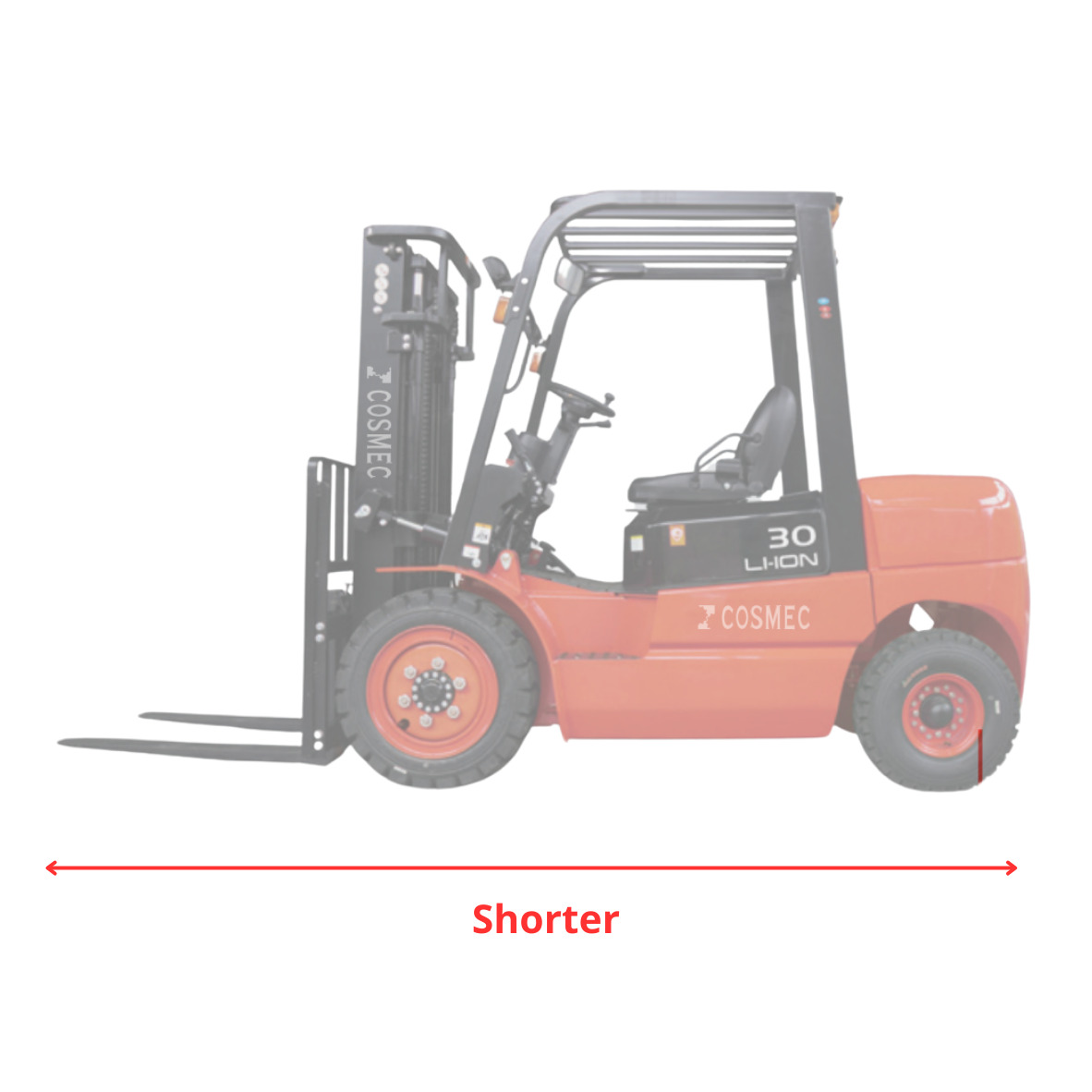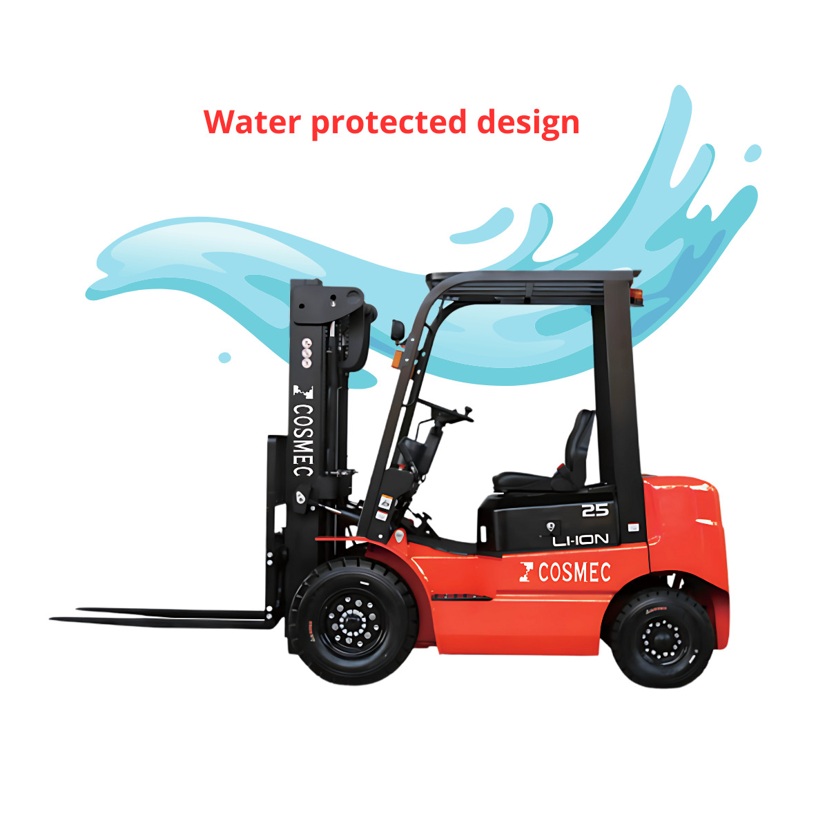 Dengan panjang keseluruhan 3573 mm, 5% lebih ringkas dibanding forklift IC biasa, ideal untuk digunakan di lorong sempit. Desain tahan air dengan rating IPX4 memungkinkan pengoperasian di luar ruangan, bahkan saat hujan